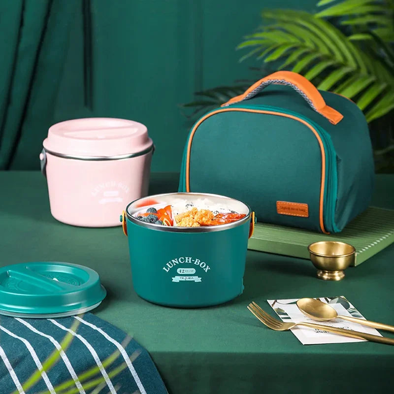 Keep meals warm and fresh anywhere with this compact, leakproof electric lunch box featuring stainless steel heating and multiple plug options.