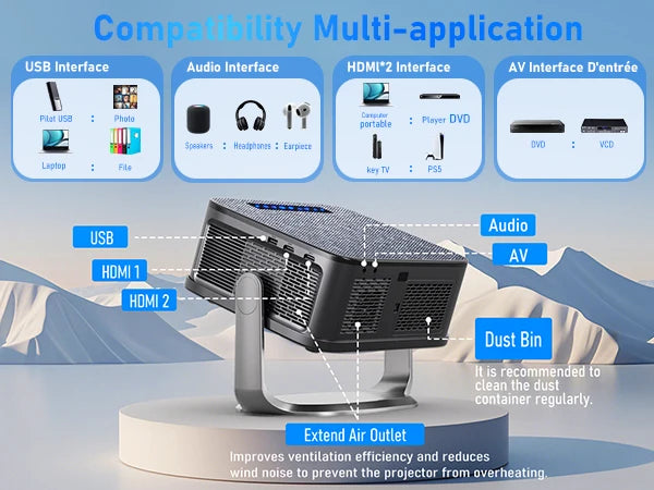 Setup is simple with auto-focus, automatic keystone correction, and four-corner screen alignment. Its wide compatibility supports screen mirroring via Miracast and AirPlay, making it ideal for both Android and iOS devices. The built-in HiFi stereo speakers enhance your experience with rich, room-filling sound.