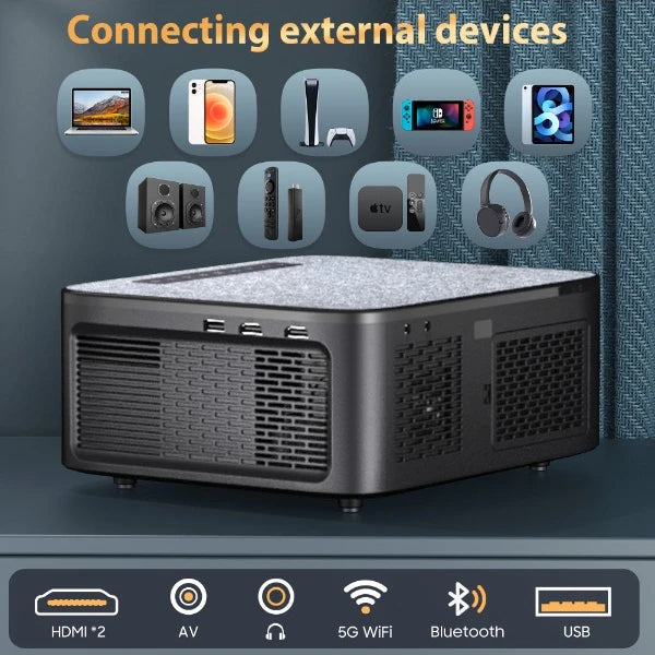 The projector supports 4K and 8K video decoding, making it future-ready for high-resolution content. Dual HDMI ports, USB, AV out, and Bluetooth 5.2 ensure seamless connectivity for gaming consoles, laptops, TV sticks, and more.