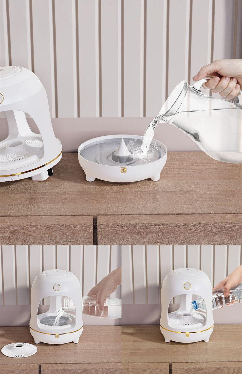 Gocce d’acqua sospese, luce LED e umidificazione silenziosa trasformano l’ambiente in un’oasi futuristica che rinnova aria e comfort.