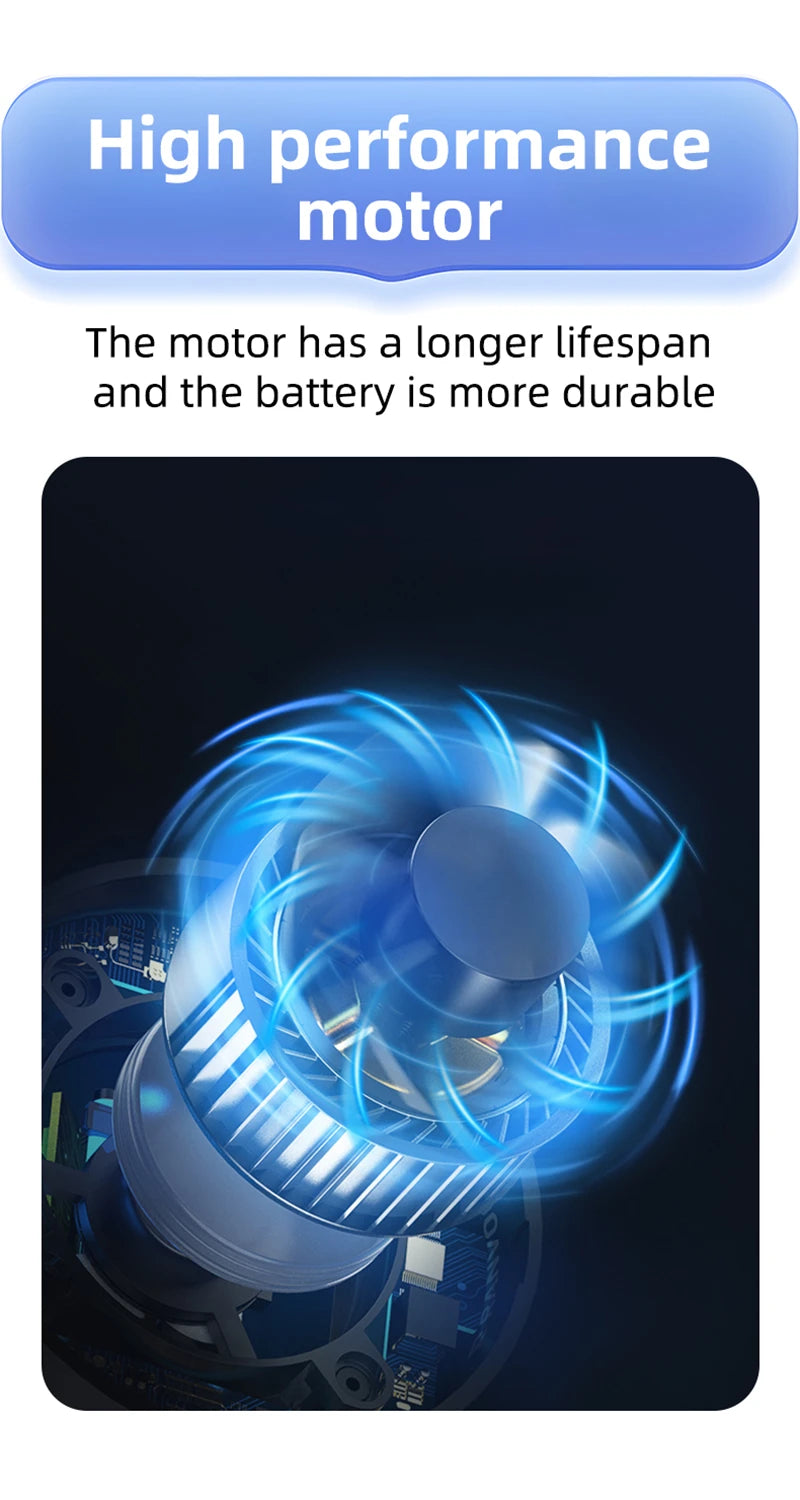 Nonostante le dimensioni ridotte, questo ventilatore offre un flusso d'aria potente, supportato da una batteria ricaricabile ad alta capacità da 3000 mAh, che garantisce un utilizzo prolungato con ricariche minime. Il display a LED integrato consente di monitorare la velocità e lo stato della batteria con chiarezza e semplicità.